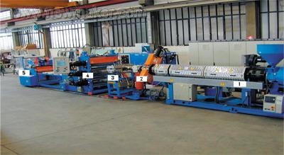 (4) 機頭和模具:機頭由合金鋼內套和碳素鋼外套構成,機頭內裝有成型模具。機頭的作用是將旋轉運動的塑料熔體轉變為平行直線運動,均勻平穩的導入模套中,并賦予塑料以必要的成型壓力。塑料在機筒內塑化壓實,經多孔濾板沿一定的流道通過機頭脖頸流入機頭成型模具,模芯模套適當配合,形成截面不斷減小的環形空隙,使塑料熔體在芯線的周圍形成連續密實的管狀包覆層。為保證機頭內塑料流道合理,消除積存塑料的死角,往往安置有分流套筒,為消除塑料擠出時壓力波動,也有設置均壓環的。機頭上還裝有模具校正和調整的裝置,便于調整和校正模芯和模套的同心度。